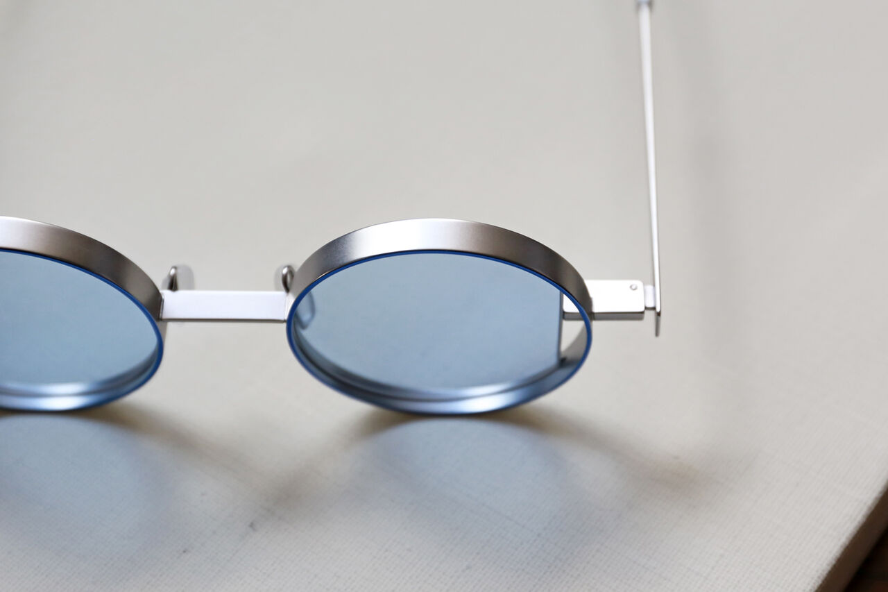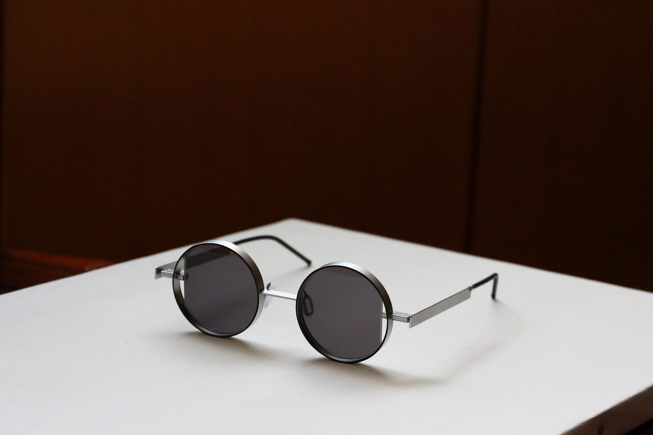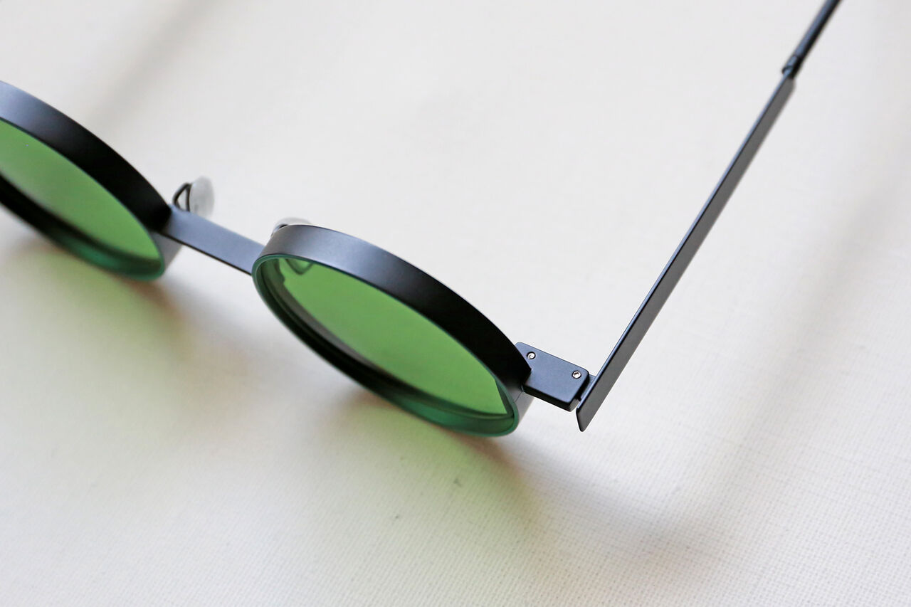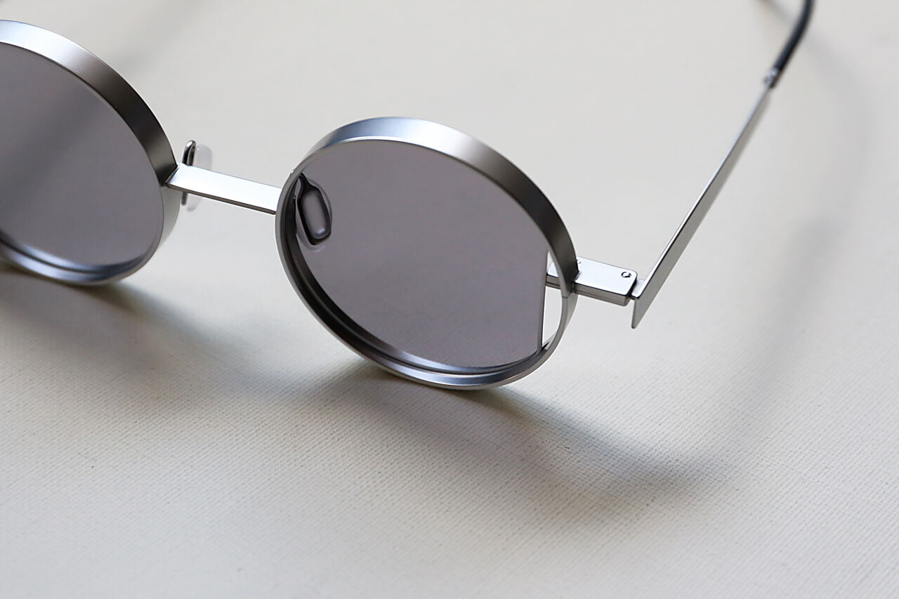メタルシートの物質感を引き出すために"折る""曲げる"などの表現を出来るだけ最小限におさえ、シンプルに設計しています。正面から見るとスッキリとした表情、側面から見ると無骨な物質感によって引き出されるキャラクター、その二面性が特徴となるアイウエアです。