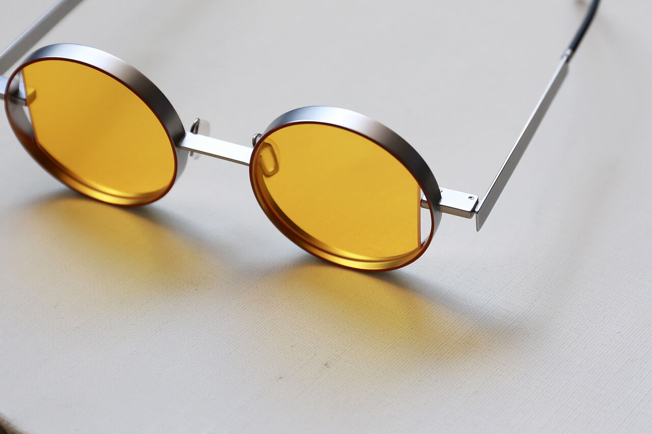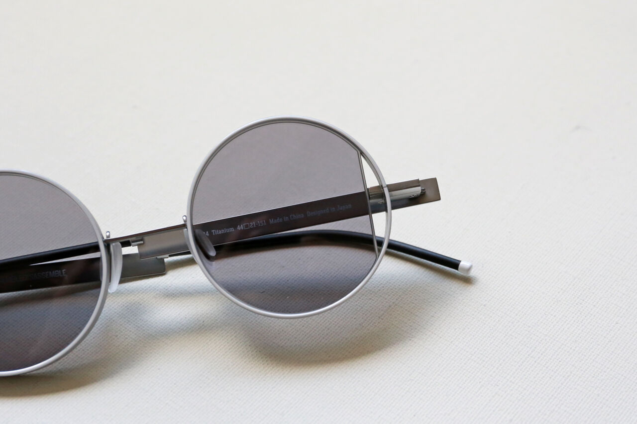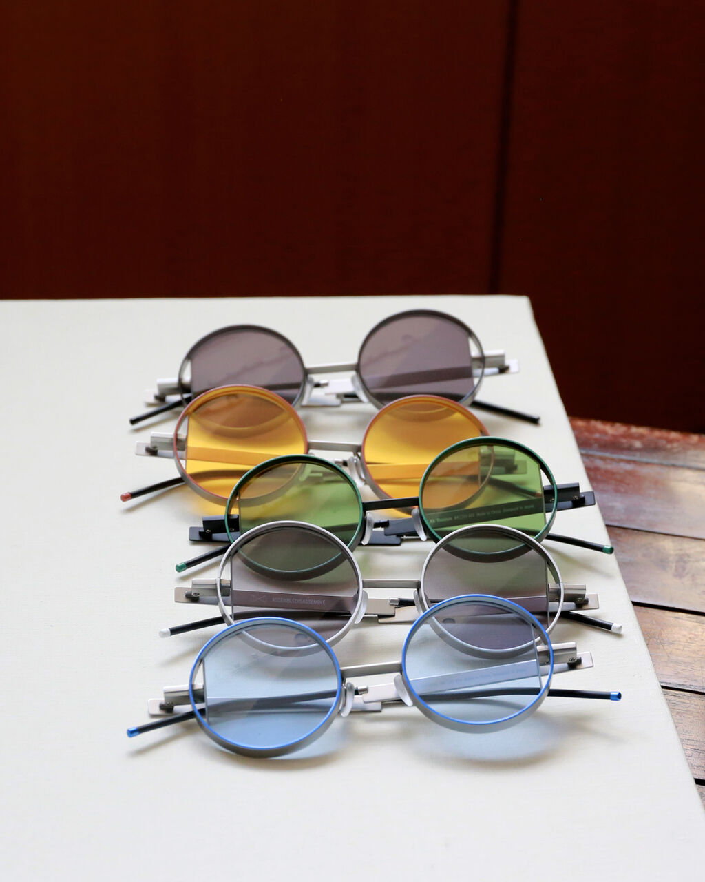 メタルシートの物質感を引き出すために"折る""曲げる"などの表現を出来るだけ最小限におさえ、シンプルに設計しています。正面から見るとスッキリとした表情、側面から見ると無骨な物質感によって引き出されるキャラクター、その二面性が特徴となるアイウエアです。