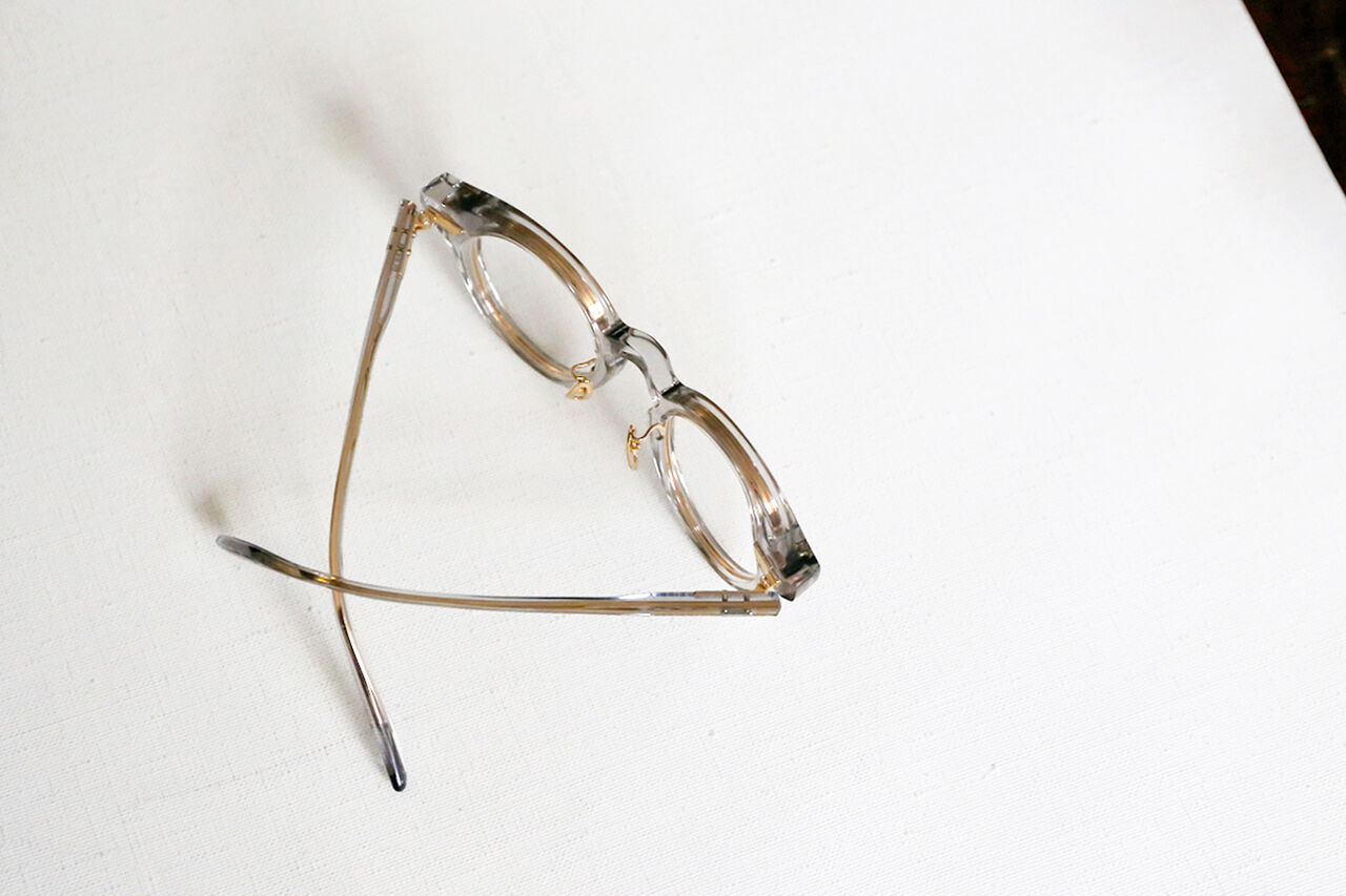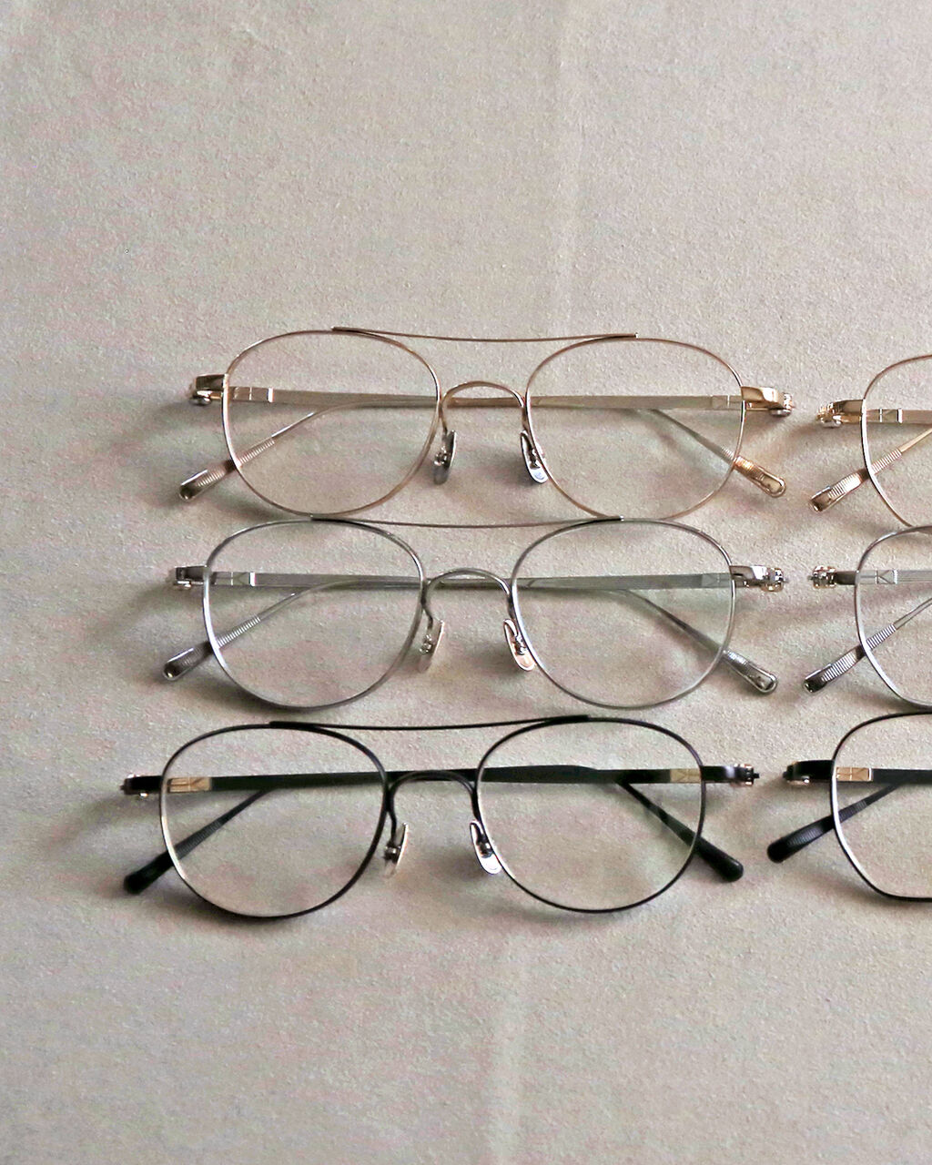 今回のコレクションに共通するのは、甲丸で奥行きのあるフード形状にデザインしたリムとブリッジ。これらは正面から見ると非常に細く繊細な印象を与えます。
