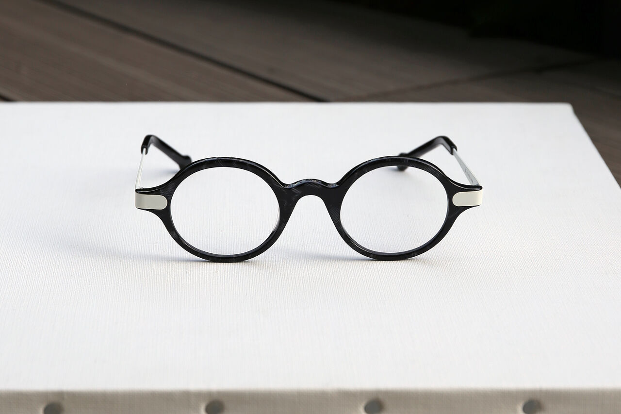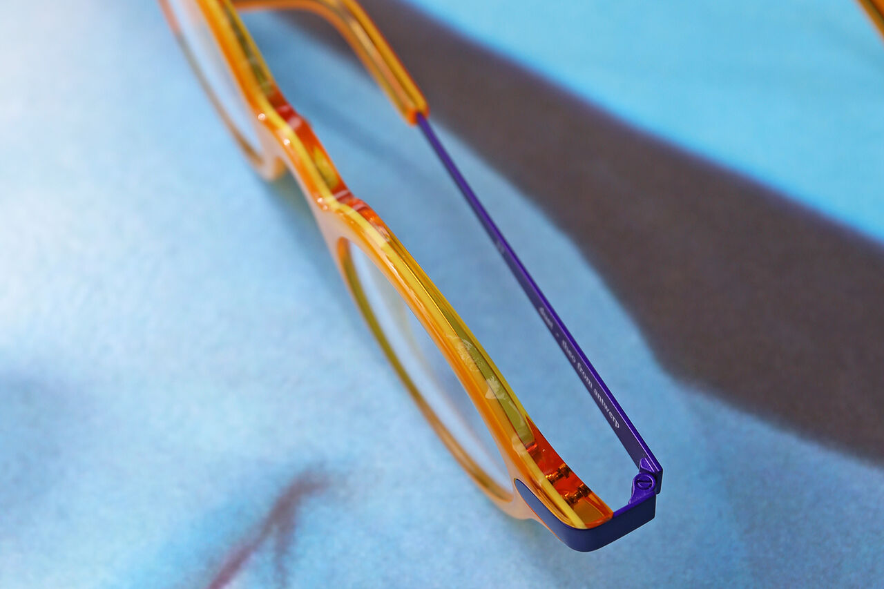 アセテート(プラスチック)の深みのある色合いや質感を、チタンの軽快で精密な造りが支え合う、異なる素材がお互いの長所を高め合うことで、デザイン性と快適性が見事に融け合っています。