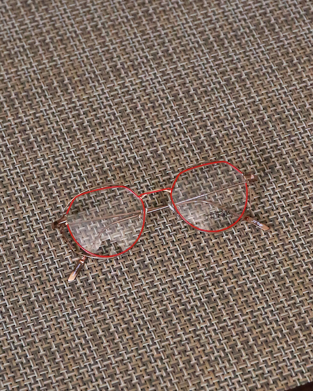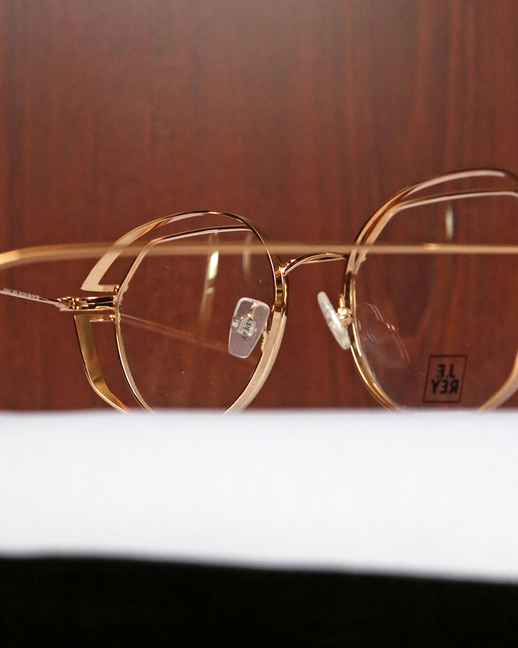 さらに、フロントリムには、赤やカーキなどの鮮やかな七宝が丁寧に施されています。これにより、ソリッドなメタルフレームに温かみのある彩りと柔らかなテクスチャーが加わり、掛ける人の個性を引き立てる魅力的な「表情」を作り出しています。