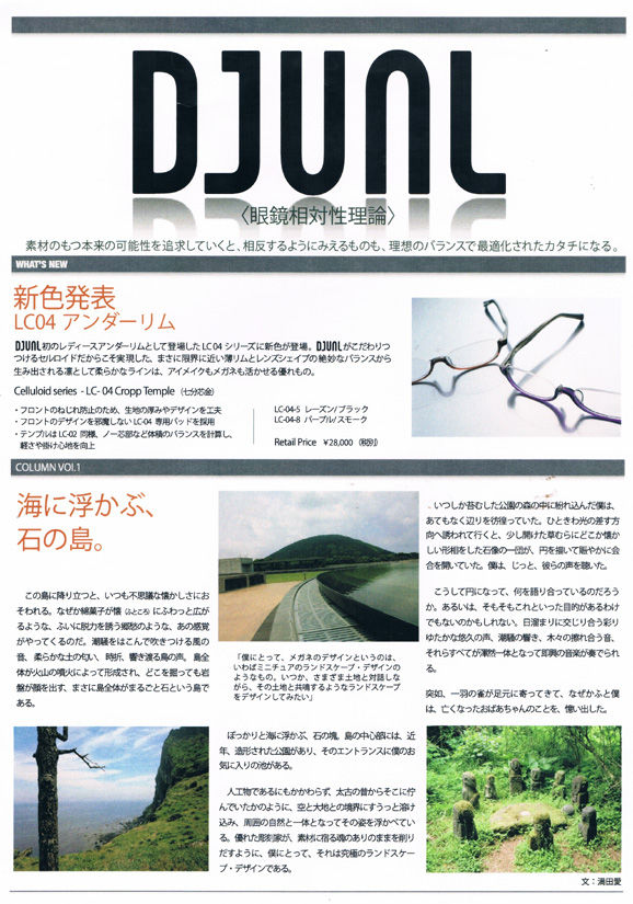 djual "デュアル" 2012年08月26日 DJUAL NEWS LETTER こんばんは、アイウェアメビウスの島です。この度、DJUAL NEWS LETTER が発行されました。新作、新色などの紹介だけでなく、ブランドのこだわりでもあるセルロイドについてのコラムを掲載。シリーズを通して、DJUALの世界観、セルロイドの特性を知ってもらおうと新しい試みです。デザイナー、山本耀司氏自叙伝『MY DEAR BOMB』の共著者、満田愛氏のコラムにもご注目下さい。(S) 「djual "デュアル"」カテゴリの最新記事 前の記事: ティアドロップのメガネ使用。 次の記事: DJUAL LC-04 新色、入荷しました。 コメント コメントフォーム 名前 コメント 評価する リセット リセット 顔 星 投稿する 情報を記憶 トラックバック